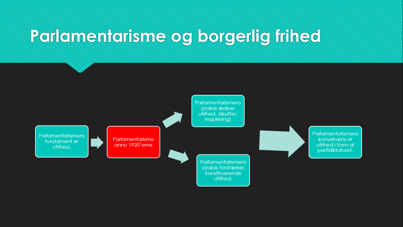 Det røde felt betegner parlamentarismen som den bestod. De kasser, der følger efter er dens konsekvenser, dvs. hvad dens praksis medfør af ufrihed. Det afgørende her er to ting. For det første, at parlamentarismens ultimative konsekvens er den totale ufrihed i og med partidiktaturet. Det andet, ligeså interessante er, at det også viser sig, at parlamentarismen ikke blot resulterer i ufrihed, men faktisk har ufrihed i sit fundament, som man kan se af boksen før den røde boks.