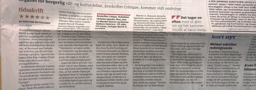 Kristeligt Dagblad bragte for nyligt en fin anmeldelse af Årsskriftet Critique 2016 i avisen. Det udkom godt nok i oktober 2016, men bedre sent end aldrig.